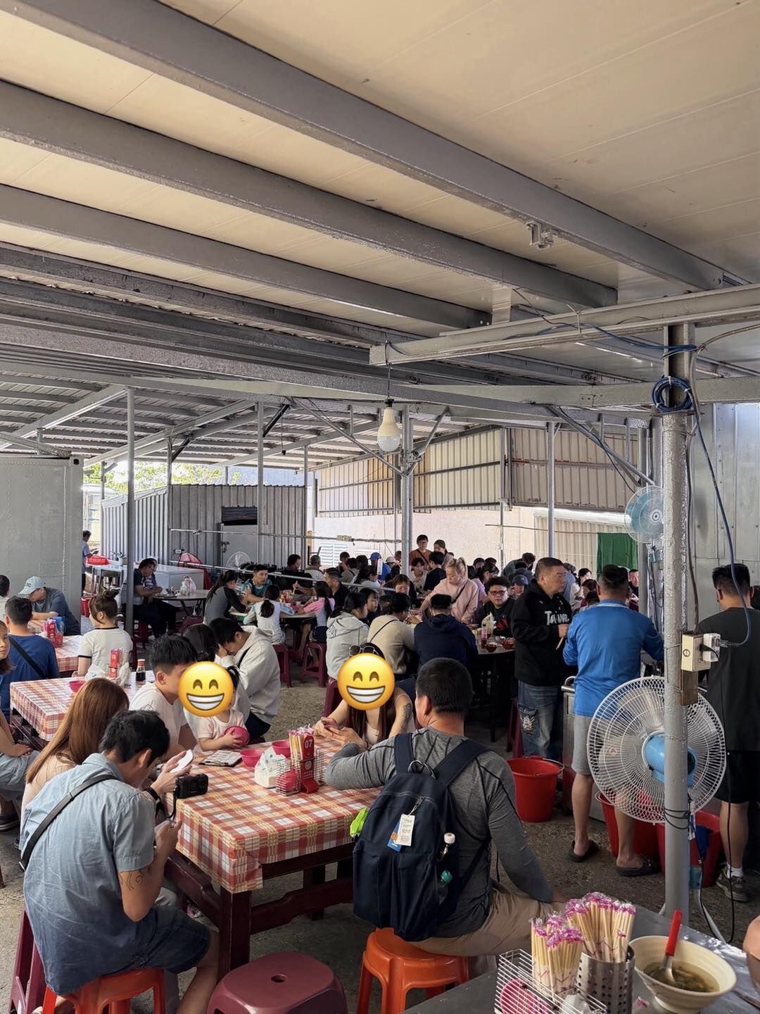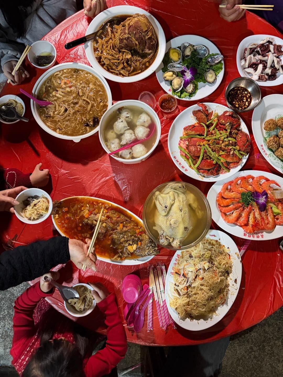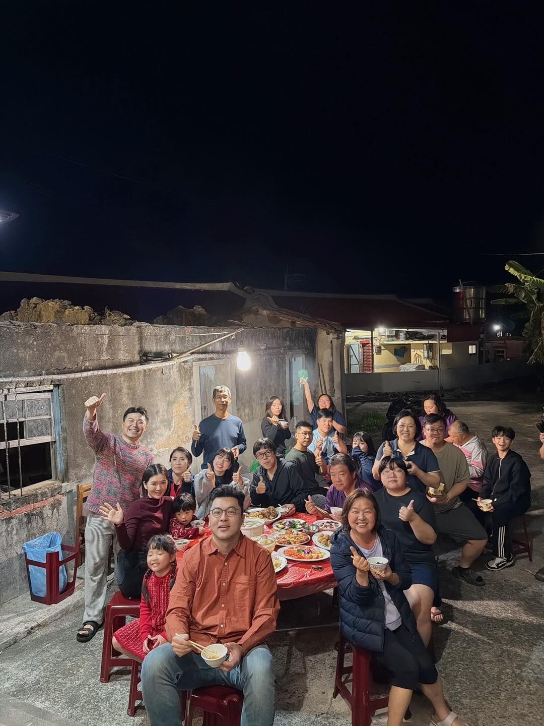 阿嬤在炸飛魚、姨丈在前面喊、其他長輩在旁邊忙著熱炒、端菜