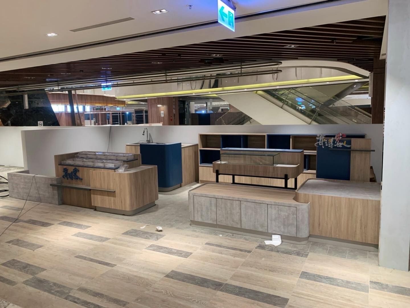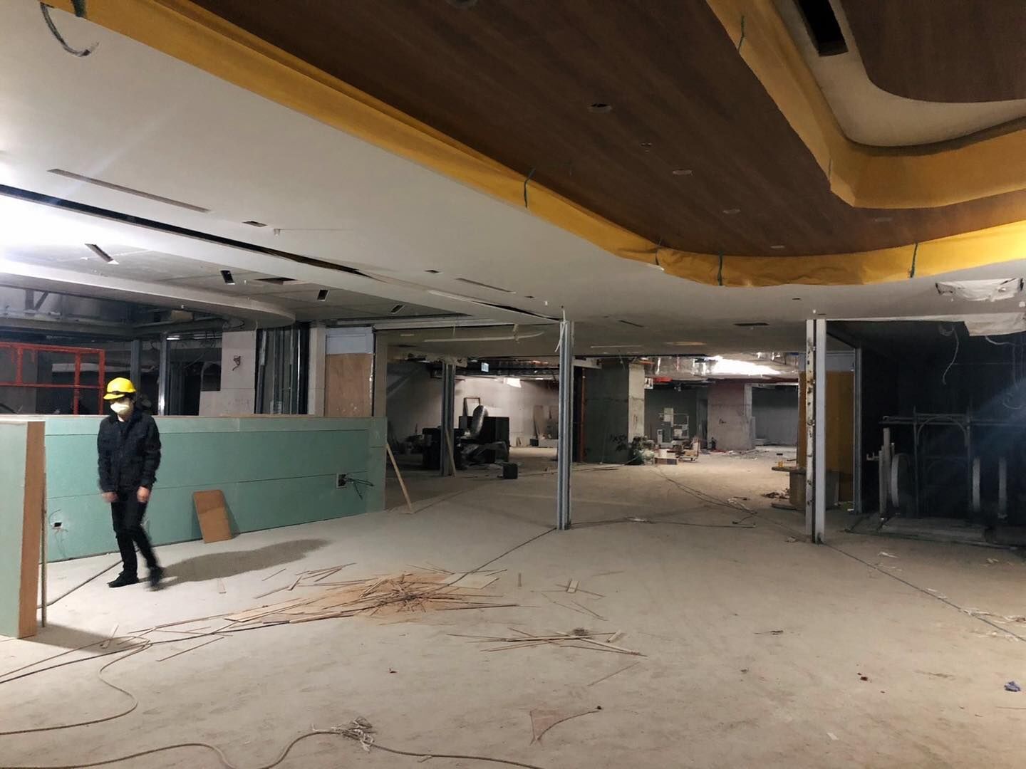 戴著工地帽,站在還沒裝潢好的櫃位前面