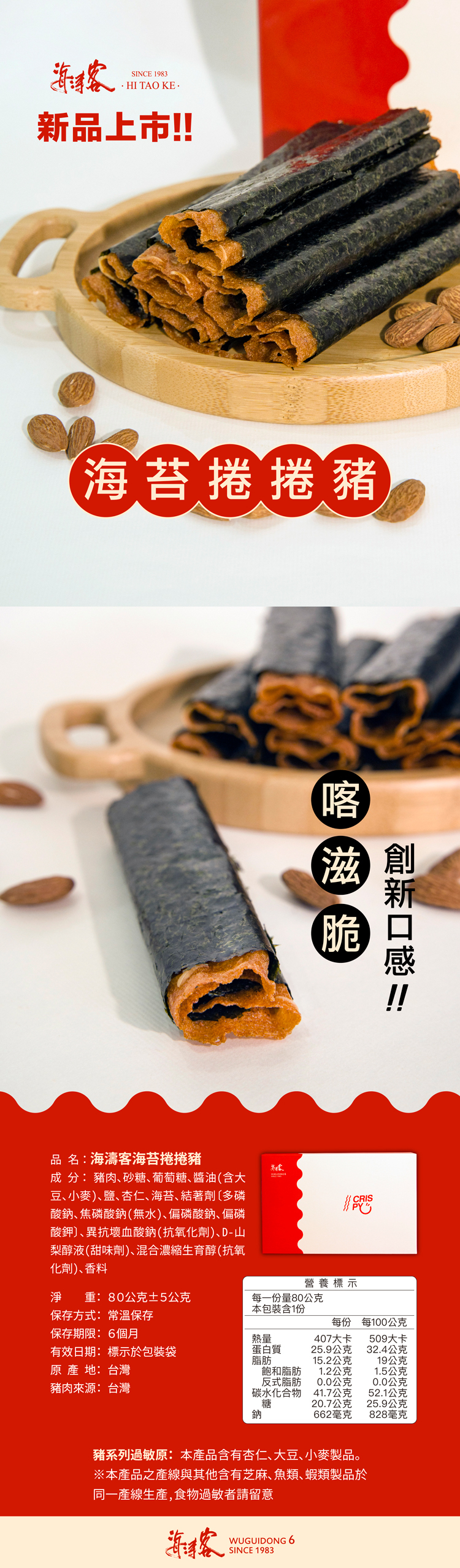 【海濤客-海苔捲捲豬】製程全程保持-7度C,維持肉質鮮度才能製成薄度0.01cm,以純手工外層捲上海苔,喀、滋、脆的創新口感,是零食創新吃法的最佳首選,海苔的鮮加上豬肉的燒烤香氣!大口咬下~在爽脆聲後是滿嘴美味的和諧,薄脆口感不管是小孩與長輩都能放心品嚐喔!