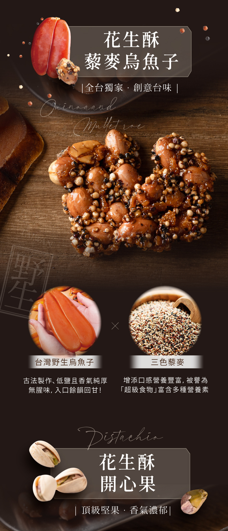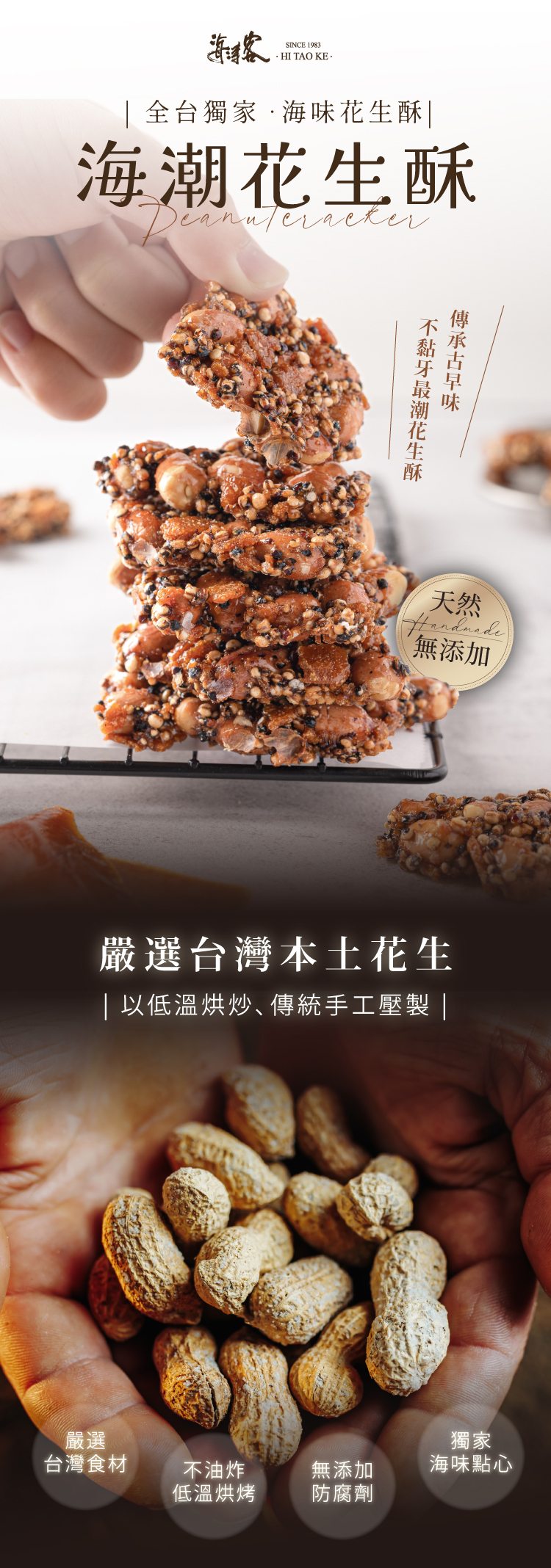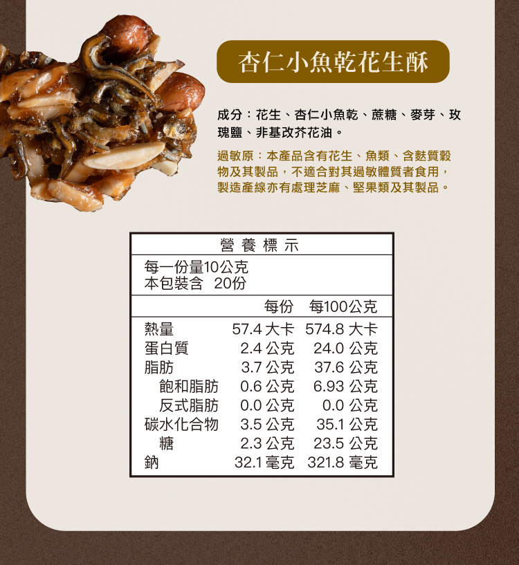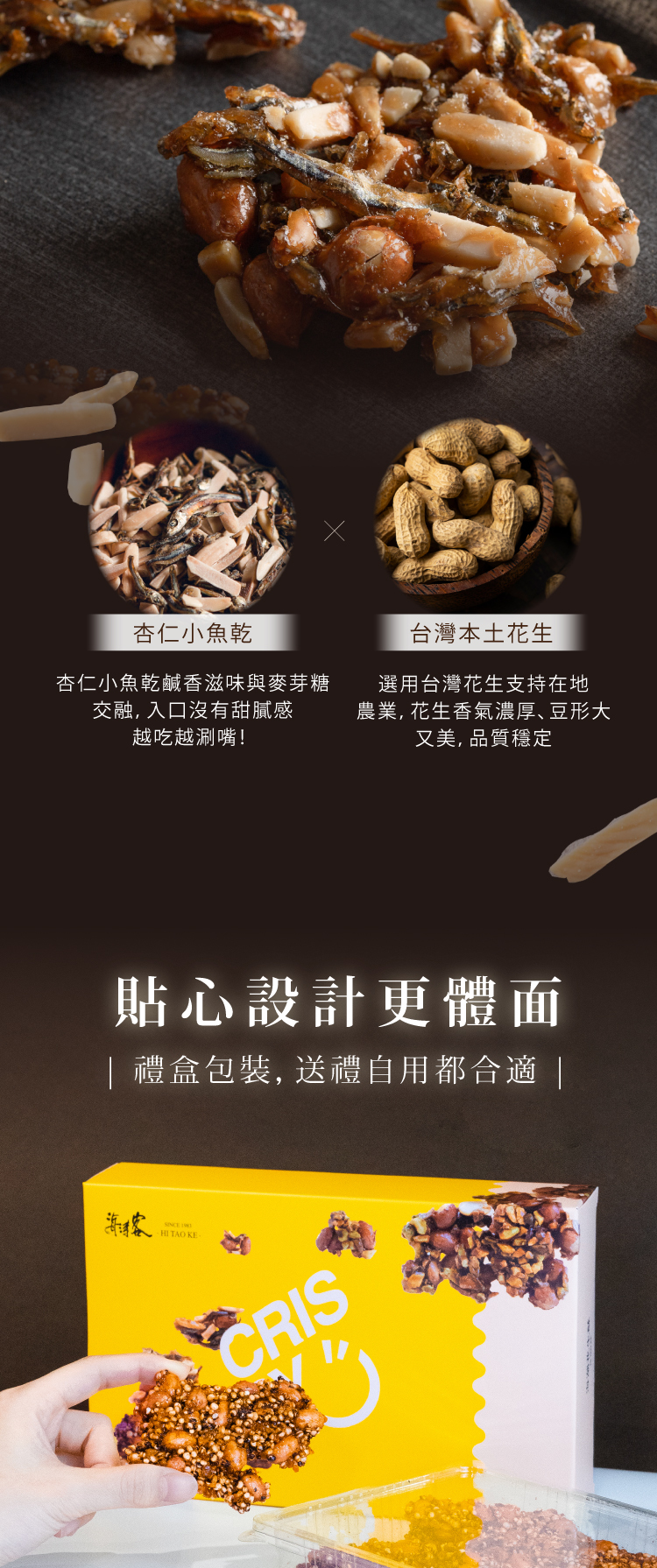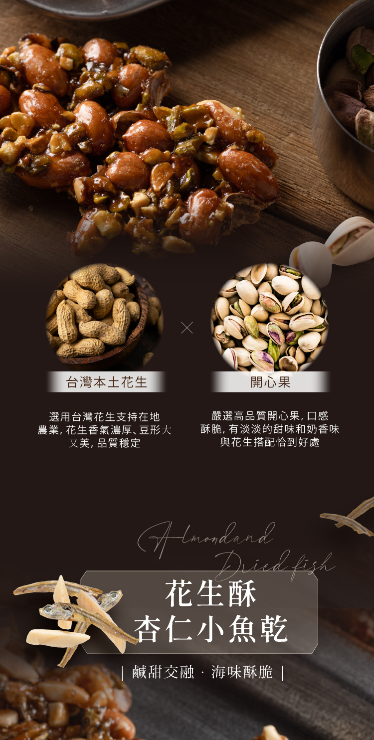 結合台灣人記憶中最熟悉的小魚乾+杏仁片,創造出鹹香酥脆的新搭配每一塊花生酥裡